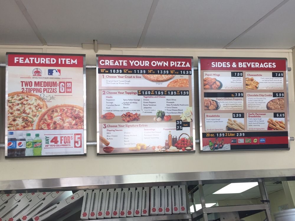 Menu - Pizza, Sides, Desserts & More | Papa Johns Pizza. Papadias. Sides. Desserts. Drinks. Extras. You're only seeing part of our full menu. Want to see all of your local pizzas and prices? Tell us which store you're closest to.