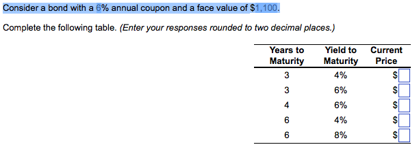 Calculation of the Value of Bonds (With Formula) - Your Article Library Find present value of the bond when par value or face value is Rs. 100, coupon rate is 15%, current market price is Rs. 90/-. The bond has a six year maturity value and has a premium of 10%. If the required rate of returns is 17% the value of the bond will be: = Rs 15 (PVAF 17%6 Years )+110 (PVDF 17% 6 years ), = Rs. 15 x (3.589) +110 (.390)