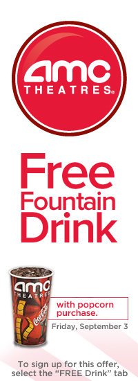 Popcorn & Drink Coupon AMC Theaters = 50% OFF! - Cuckoo For Coupon Deals So excited, right now AMC Theaters is offering a coupon for 50% off a Large popcorn and Large Fountain Drink Combo! Coupon details: Offer vaild from August 26th to September 8th, 2011 at any participating US AMC theater; Dine-In Theaters not included. AMC Stubs free upgrades are not eligible with this offer. Limit one coupon per guest, per visit.