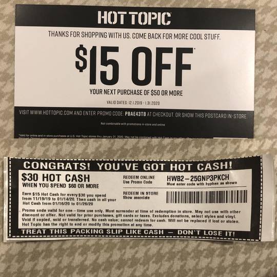HOT TOPIC | POP CULTURE AND MUSIC INSPIRED FASHION Hot Topic is the destination for music and pop culture-inspired clothes and accessories, plus fashion apparel for girls and guys. Looking for t-shirts and merch from the bands you love? We have 'em. Need a pair of jeans to go with that t-shirt? We got you covered. How about Funko figures from your favorite characters? We have those, too. Hot Cash | Hot Topic WHAT IS HOT CASH? Hot Cash is a coupon program designed to save you money at Hot Topic! You can earn a $15 Off Hot Cash coupon for every $30 you spend. WHEN DO I EARN HOT CASH? Hot Cash is earned during specific earning periods online and in stores. The amount earned is based on the total amount of an eligible purchase, before any discounts or ...