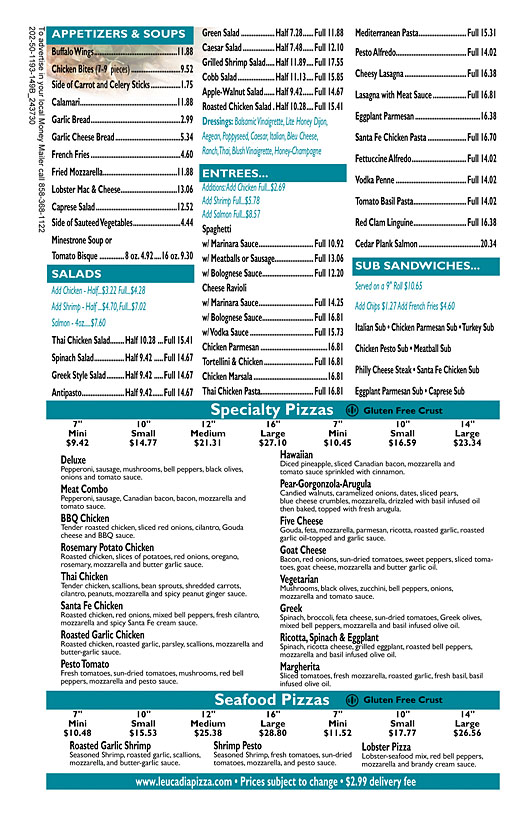 Leucadia Pizzeria & Italian Restaurant-La Jolla - all specials Family Special $41.18 - Large 16" Cheese Pizza, Spaghetti with Marinara Sauce, Garlic Bread, Full Size Caesar Salad and a Container of Chocolate Chip Cookies *Additional toppings, Any item can be substituted for an additional cost. Price and offer subject to change Pizza & Wing Combo $27.42 - Large Cheese Pizza & an order of wings