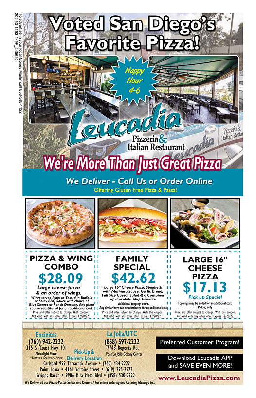 Leucadia Pizzeria & Italian Restaurant For reservations, delivery or catering, call the location nearest to you. We deliver anywhere in the greater North County San Diego area. Scripps Ranch 9906 Mira Mesa Blvd , Scripps Ranch (858)-530-2222 marketing@leucadiapizza.com Visit us Carlsbad 959 Tamarack Ave Carlsbad, CA 92008 (760) 434-2222 Visit us Carlsbad - Delivery Areas: